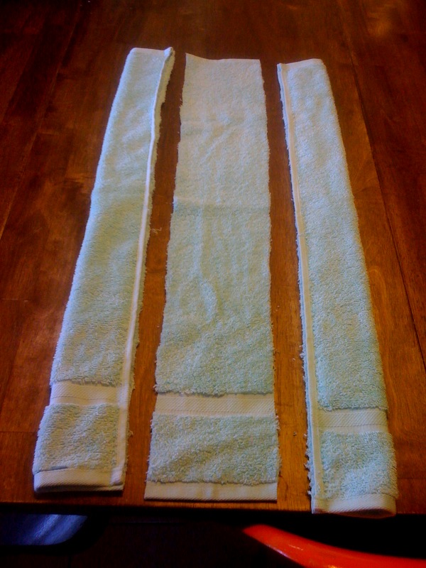 I found the initial instructions online here, and made a few modifications. Namely, I used 2 hand towels instead of one because I wanted the carrying straps to be longer. Also by using a folded hand towel for the pocket, as opposed to half of a hand towel the final product has the bonus of another pocket. I am really happy with how they turned out! I've included the instructions below in case anyone is interested in making one: